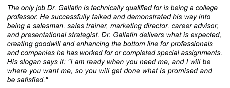 MediaDr. Gallatin has been on Oprah, Live with Regis Philbin, Geraldo, Donahue, and Sixty Minutes. On the ABC National Television special "99 Ways to Meet the Right Man." Emmy Award Actress Susan Lucci introduced his seminar Lover Shopping® at Bloomingdale's "As the most imaginative idea of all." Dr. Gallatin's work has been featured in The New York Times, Newsweek, and Glamour. Dr. Gallatin has demonstrated his techniques work in real-life situations on TV, radio and the print media. Reporters are encouraged to attend his Lover Shopping® Seminars conducted in supermarkets, department stores, and museums in many markets, including New York, LA, Milwaukee, and London. At a Manhattan seminar, an executive of the NFL observing said, "This stuff works." Education and Training CredentialsMartin Gallatin got his degrees in Sociology. His bachelor's is from LIU, and his master's and doctorate are from NYU. He is a professor at Touro University's School of Careers and Applied Studies in New York City. He is the academic supervisor for The Human Services Field Project Internship Program. Dr. Gallatin was a pioneer in online education, having taught Sociology and Marketing from the get-go. Professor Gallatin was voted "Instructor of the Year" in 2005. Presentational StrategistDr. Gallatin is a presentational strategist who uses his understanding of sociology, human nature, sales, marketing, and humor to show professionals and businesses how to develop persuasive presentations and maximize their effectiveness. And engage with anyone, anywhere, anytime, to create personal and professional relationships that enhance happiness and business success. Practical Business BackgroundDr. Gallatin was a sales training manager for a 300-person national sales force of engineers in manufacturing. He was the sales trainer for a major real estate marketing firm selling luxury condos and co-ops in Manhattan. In addition, he was the sales trainer for the leading Century 21 franchise in the United States, located in Queens, New York. Dr. Gallatin was a presentational trainer and salesperson for a career services firm in Manhattan, assisting mid-and high-level executives seeking new positions and career advice. He also ran a resume service on Madison Avenue for the largest resume service in the United States and was director of Grand Street Settlements Job Cooperative.